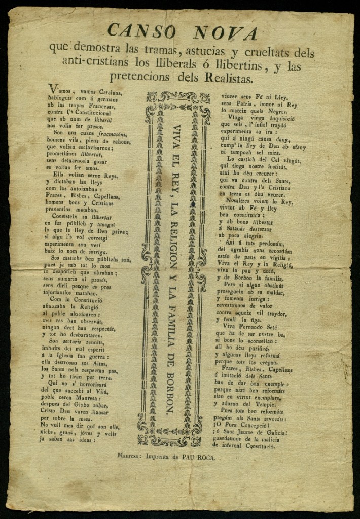 Al margen de los hechos históricos concretos, a un servidor le gustaría resaltar la causa de fondo de este conflicto, de vital importancia para su comprensión y para entender la historia de España hasta nuestros días. Como hemos señalado anteriormente respecto de la Guerra de Independencia, se había producido un choque de mentalidades entre la España católica tradicional y las ideas de la modernidad, que es exactamente lo mismo que produciría los conflictos posteriores, desde la Guerra de los Agraviados (dels Malcontents, en catalán) hasta la Guerra Civil de 1936-1939, pasando por las Guerras Carlistas. El factor religioso en todos estos enfrentamientos no es casual ni accesorio, es nuclear. Y no, no es que los constitucionalistas fueran «come curas» (adjuntamos imagen de un documento[1] constitucionalista donde, en la segunda columna, se defiende que la Constitución protege a la religión, y otro que precisamente desmiente tal cosa[2] en su punto noveno), pero los conceptos que introducía el liberalismo atacaban directamente a lo más profundo del catolicismo: sus principios. Era una ideología disolvente y así supieron verlo muchos en su momento. Como decía una canción[3] realista, también ésta en catalán (y sin concesiones políticamente correctas, claro, pues eran otros tiempos),
